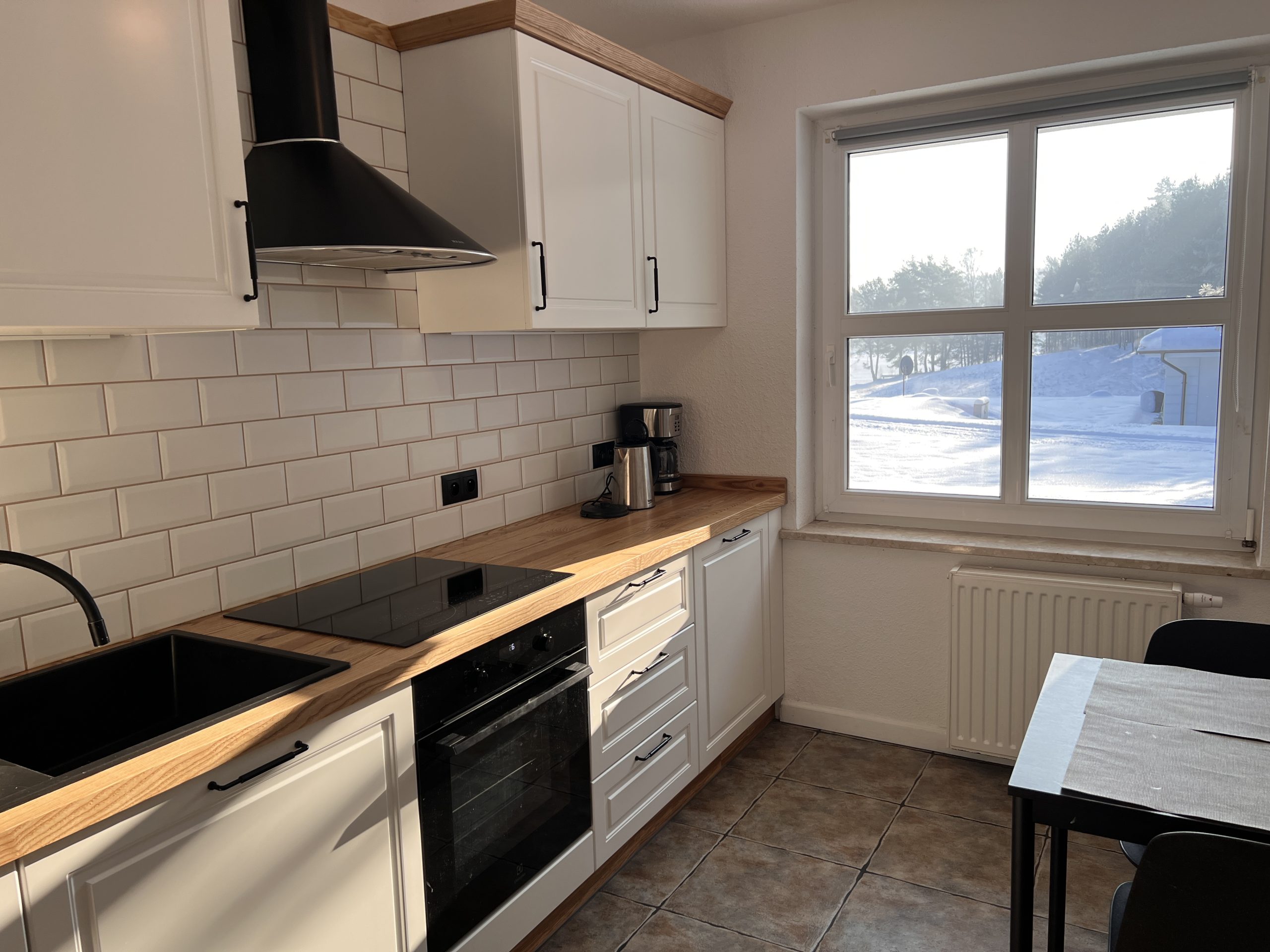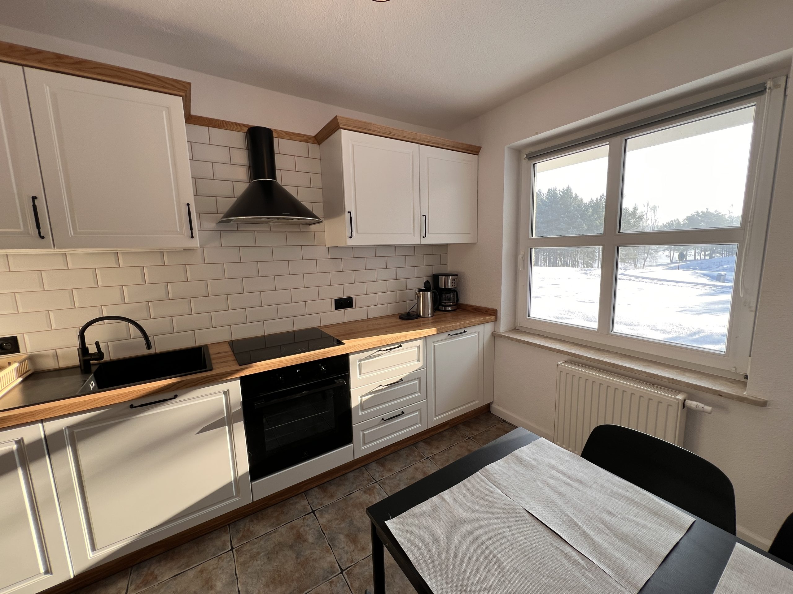 W domku znajduje się kuchnia z pełnym wyposażeniem: komplet naczyń, płyta indukcyjna, piekarnik, czajnik elektryczny, zmywarka, lodówka, stół z krzesłami.
