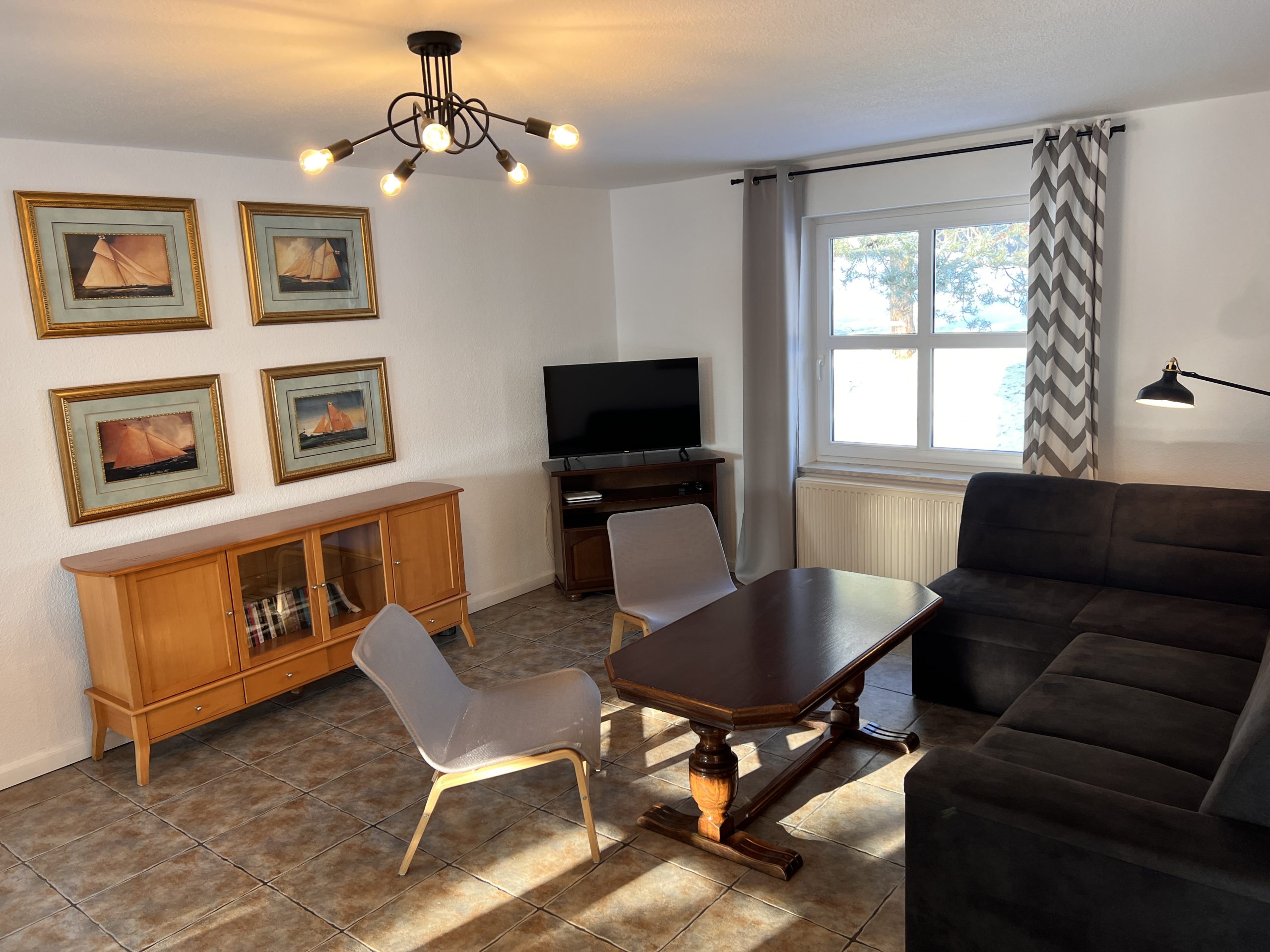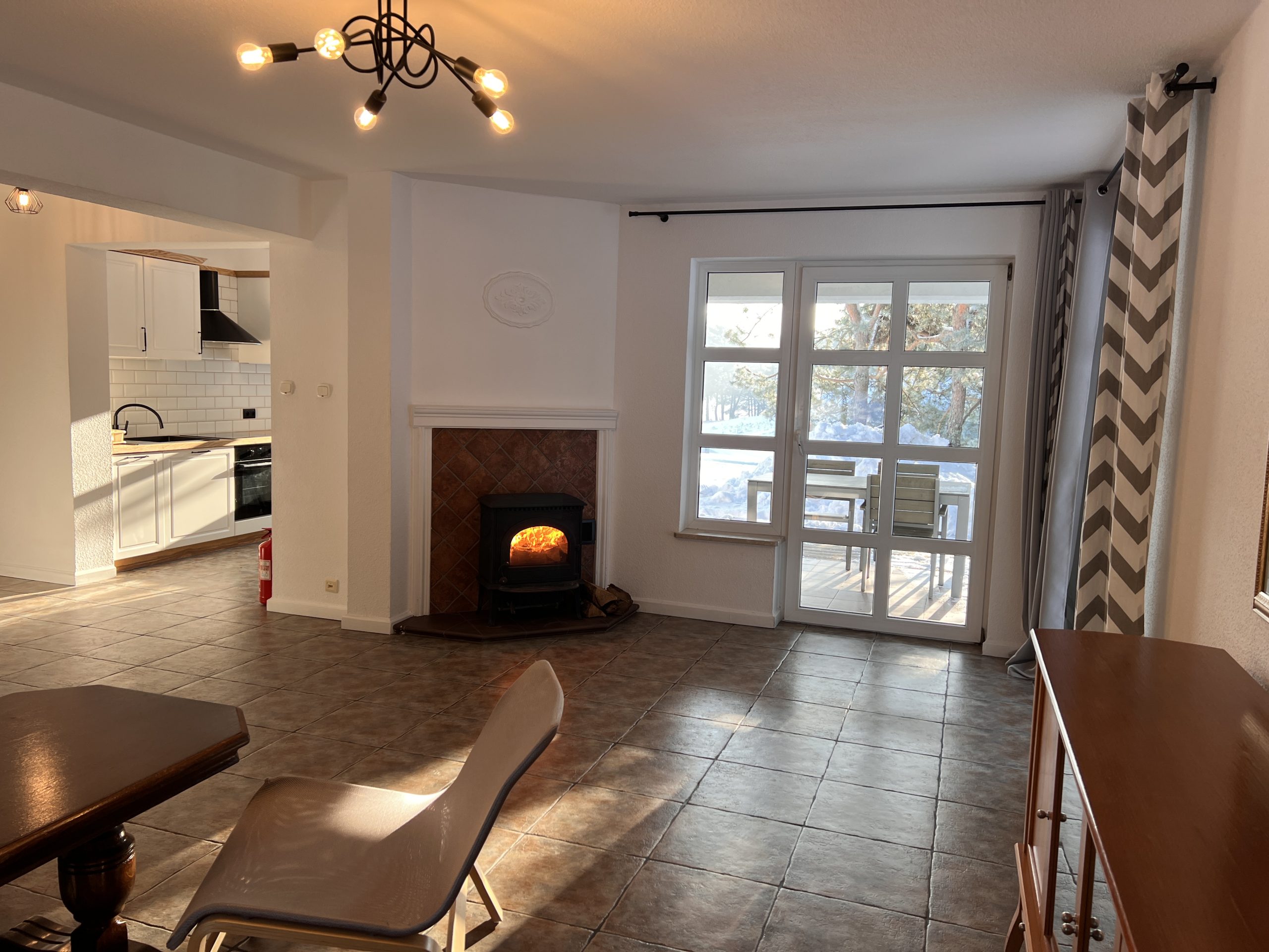 Salon wyposażony jest: w kominek typu koza przeszklona, część wypoczynkowa z rozkładanym narożnikiem i dwoma fotelami, telewizor płaski z pakietem programów satelitarnych, dostęp do Wifi.