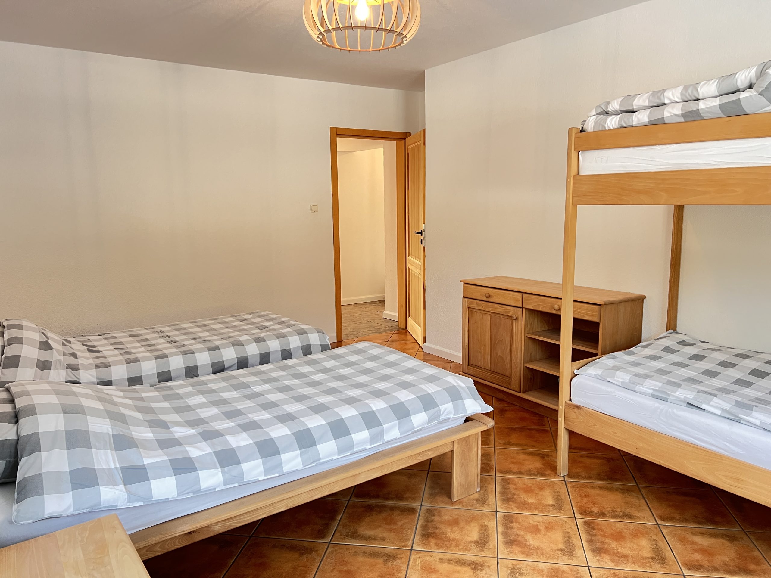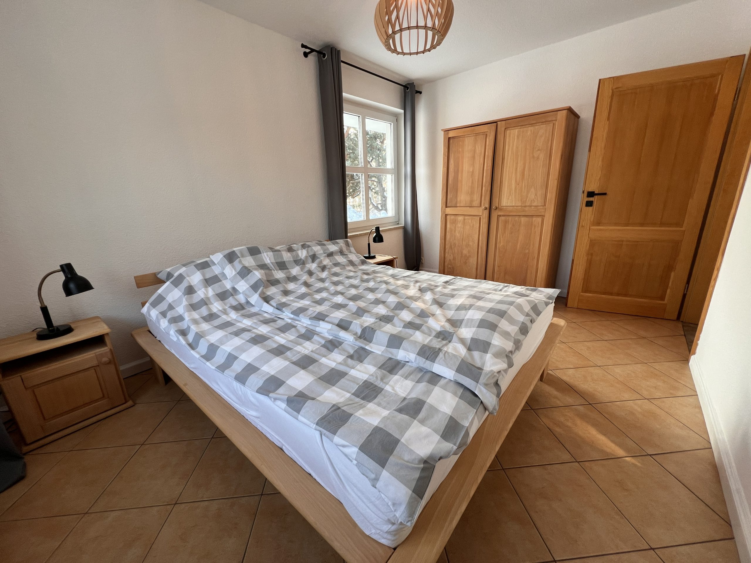 W domku są dwie sypialnie. Sypialnia mała z łóżkiem małżeńskim 160x200cm szafki nocne przy łóżku szafa na garderobę. Sypialnia duża z dwoma łóżkami pojedynczymi i łóżkiem piętrowym na dwie osoby, szafki nocne i dwie komody.