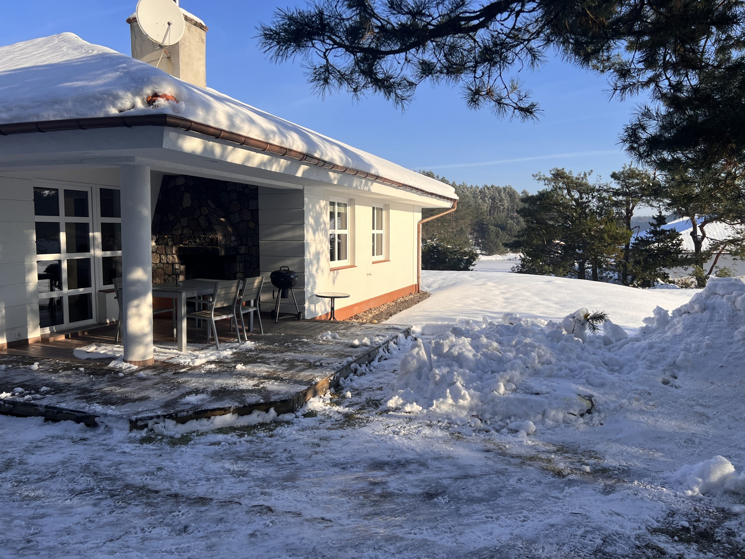 Domek ma taras z meblami ogrodowymi, grillem i kominkiem zewnętrznym.